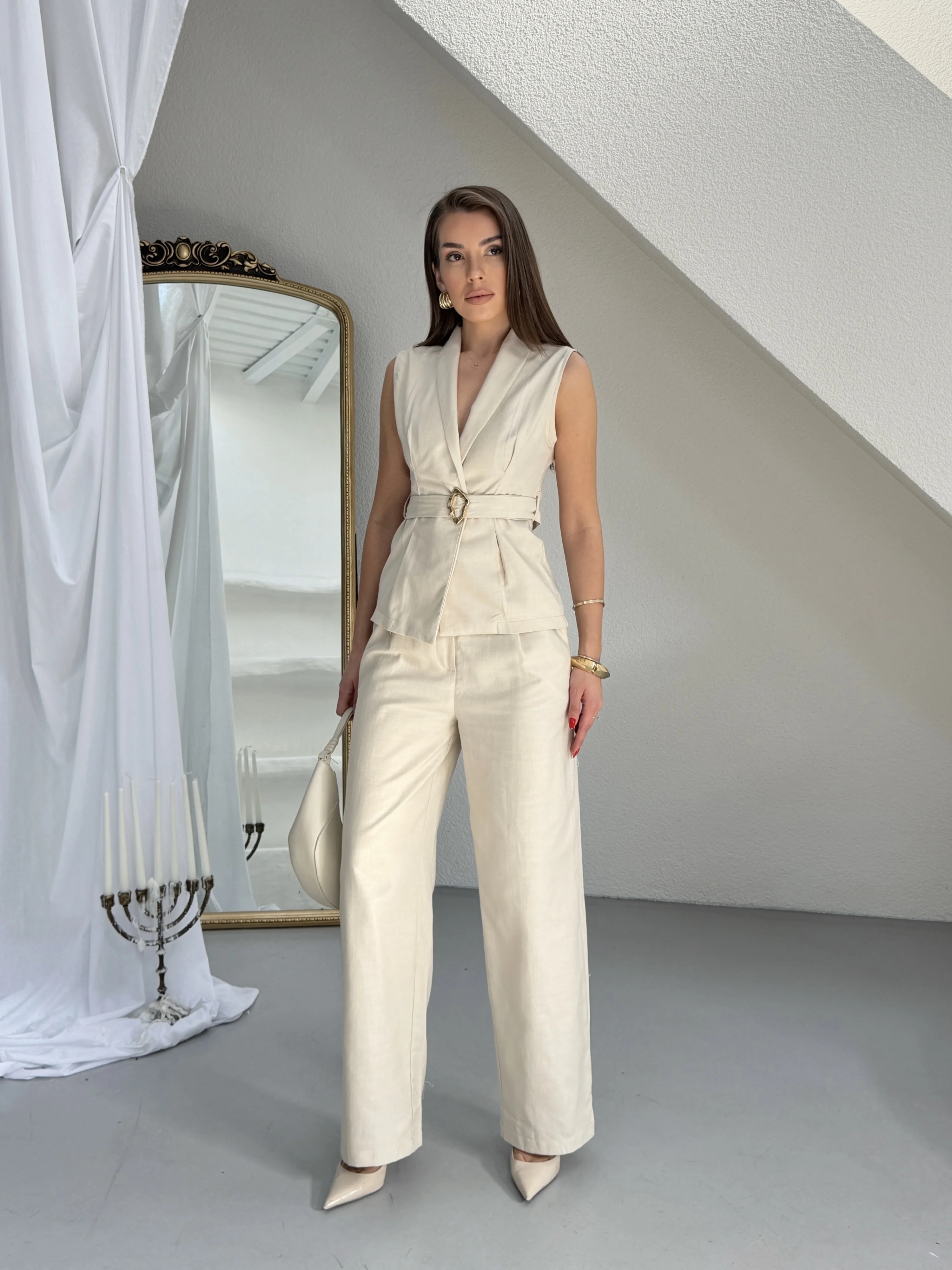 Gold tokalı bağlamalı yelek detayıyla öne çıkan bej keten takım; hafif ve nefes alabilir kumaşı sayesinde yaz kombinlerinde şık ve rahat bir kullanım sunan modern bir settir.