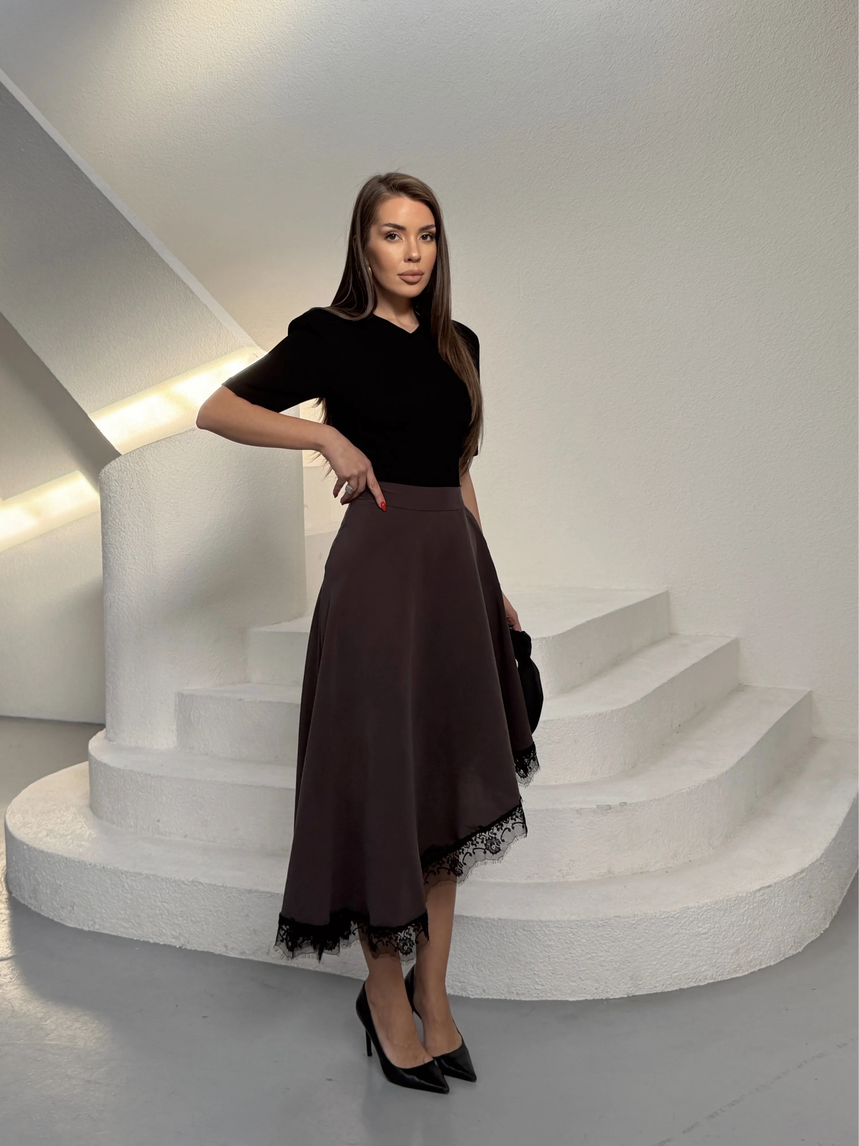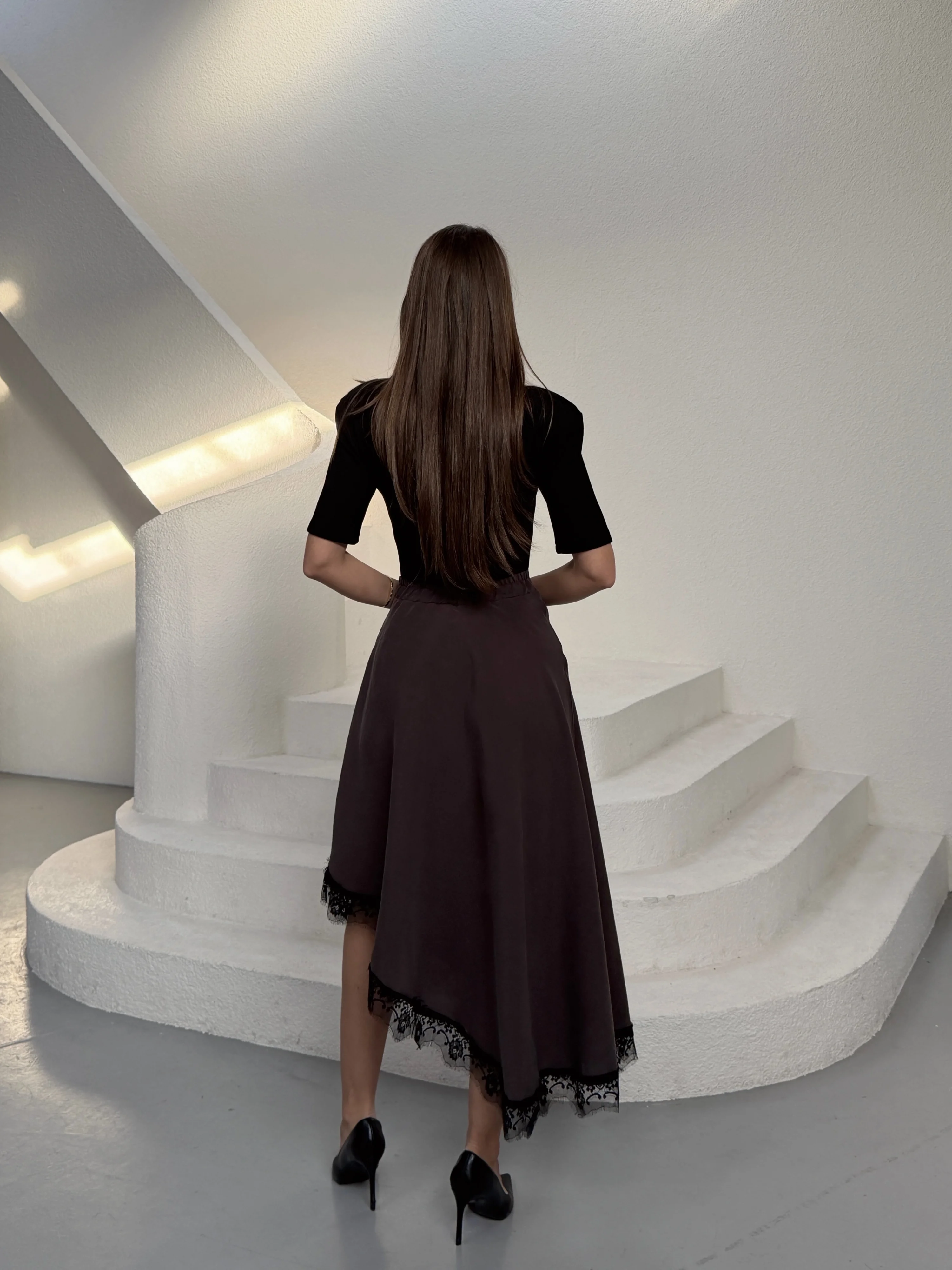 Kahverengi Modal Dantelli Etek