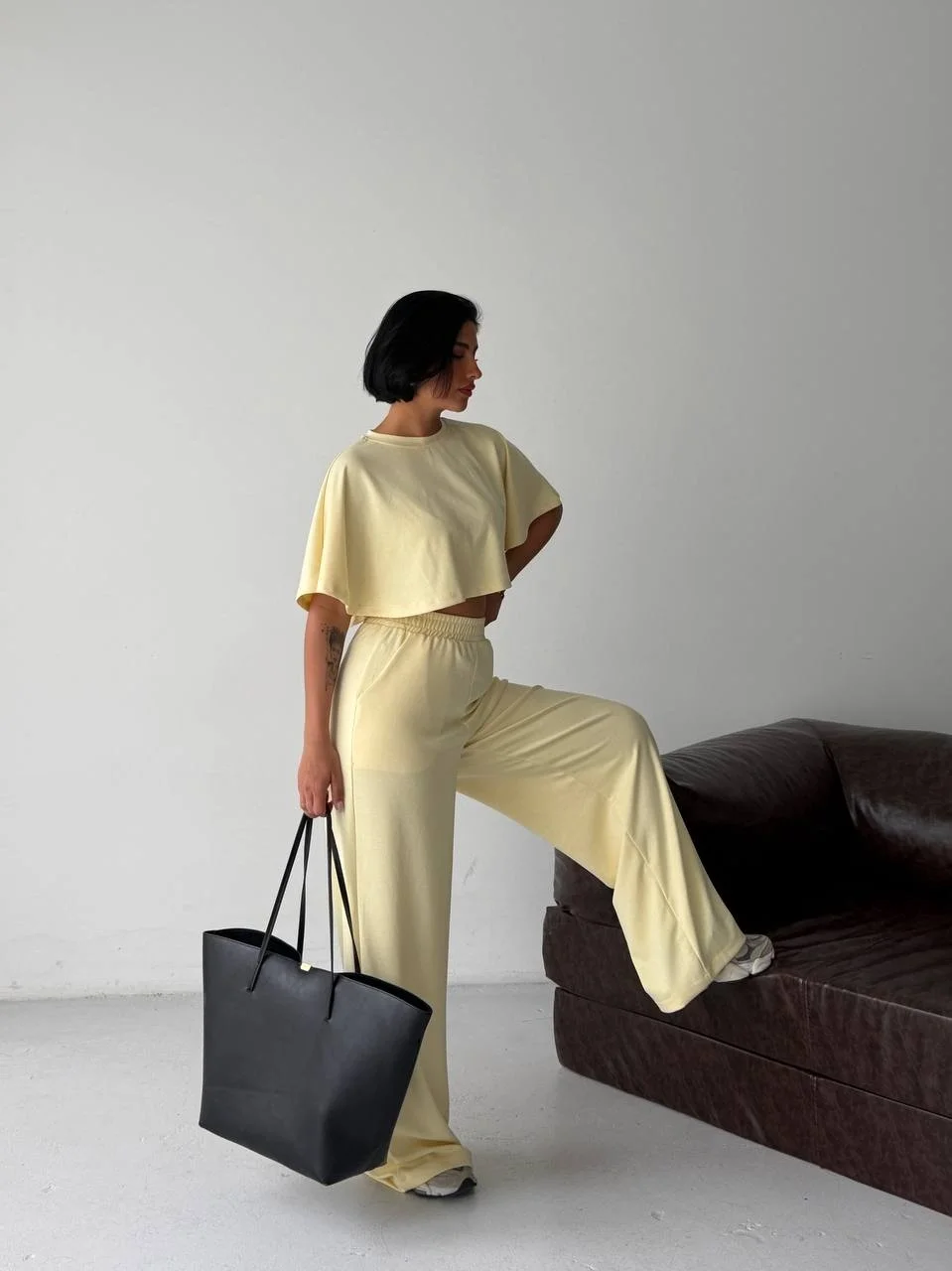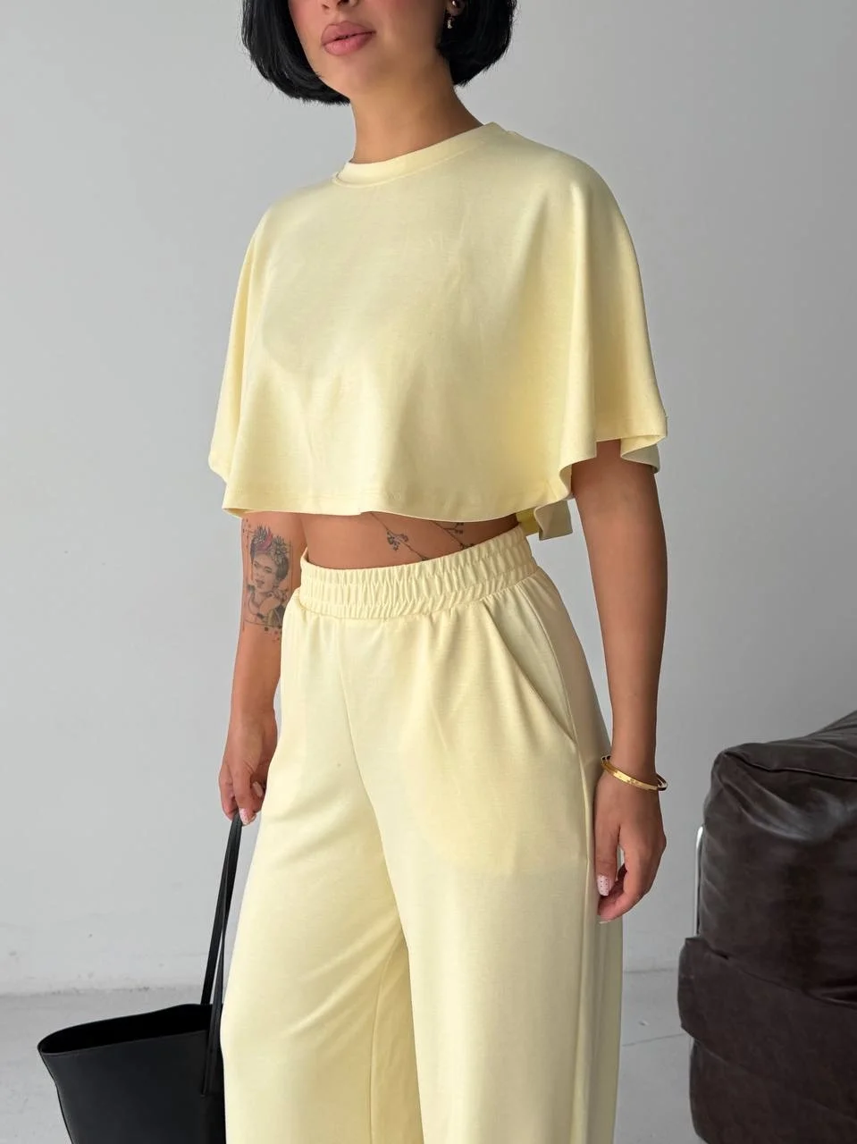 Sarı Crop Beli Lastikli Palazzo Eşofman İkili Modal Takım
